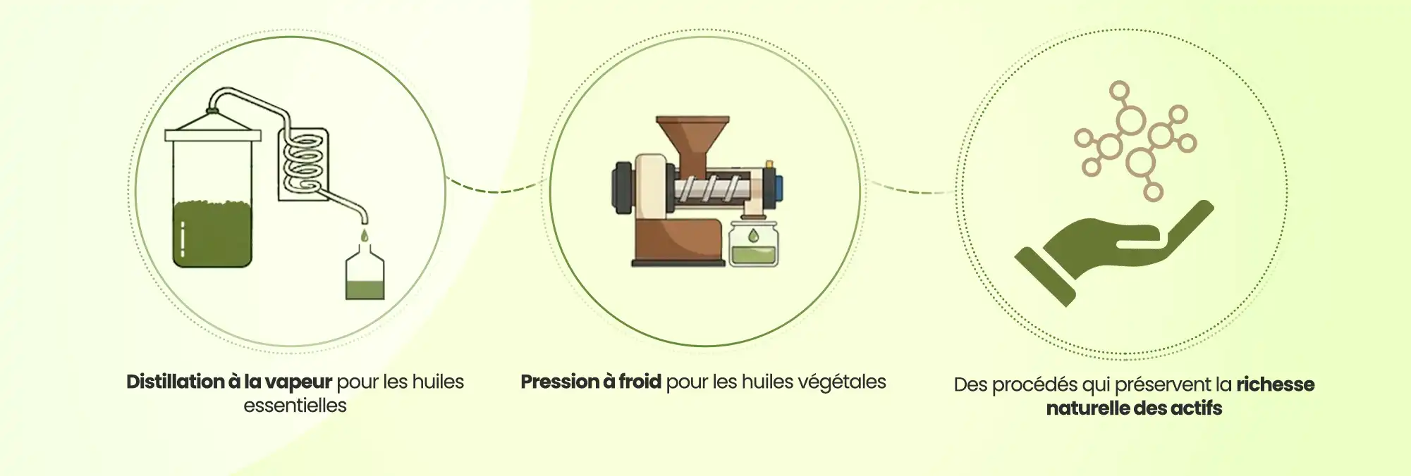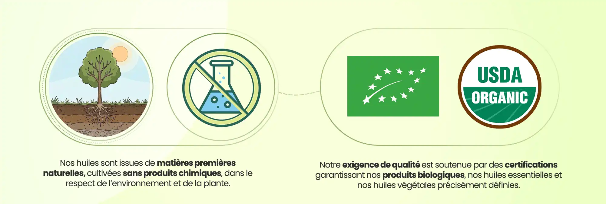 Nos huiles sont issues de l’agriculture biologique, garantissant des matières premières naturelles, sans substances chimiques de synthèse ni pesticides.