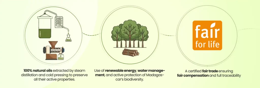 From steam distillation to cold pressing, we preserve the integrity of natural active compounds. We adopt responsible practices: ecosystem preservation, renewable energy sources like eucalyptus wood, and optimized water management.