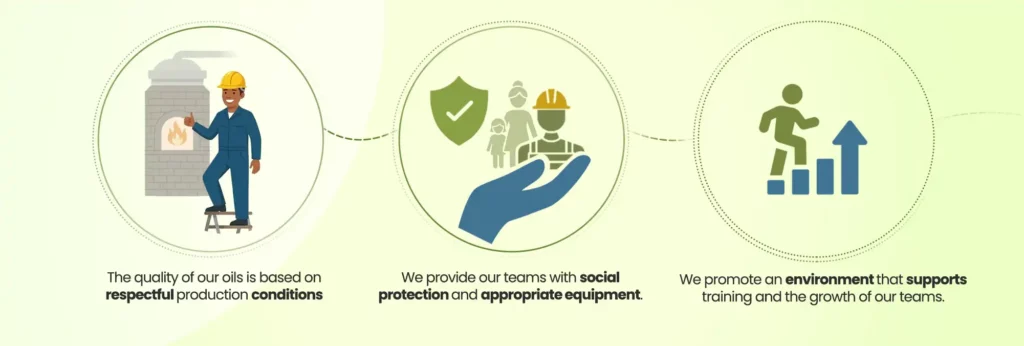 The quality of our oils is directly dependent on production conditions. We guarantee our teams access to social protection, proper equipment, and an environment conducive to training and development.