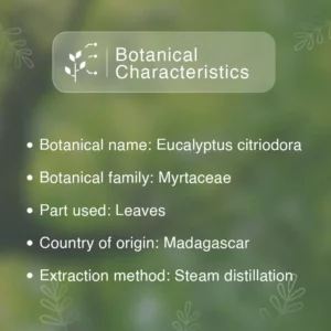 Lemongrass and citronellol are the main ingredients in the essential oil of lemony eucalyptus. These two molecules are responsible for the virtues of citriodora essential oil