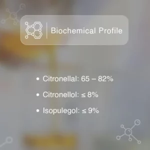 Allergenic biochemical components are present in lemon eucalyptus essential oil: citronellol (≤8%), linalool (≤1%), eugenol (≤1%), geraniol (≤0.5%), limonene (≤0.5%), and citral (≤0.2%). A good citriodora essential oil should meet these specifications. Don’t hesitate to ask your supplier to ensure the quality of your oil.
