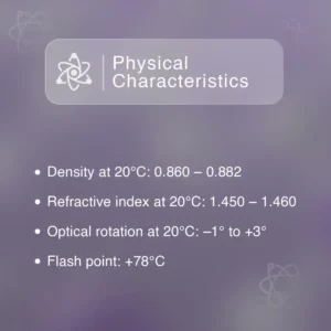 It blends very well with Palmarosa, Lavender, Ravintsara, and Lemongrass to create purifying and refreshing synergies.