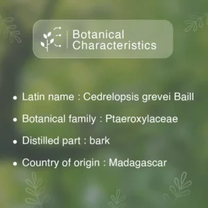 It is possible to export katrafay essential oil from Madagascar. Aromeya is a katrafay essential oil wholesaler, distributing it worldwide. Katrafay, meaning “bitter juice,” is scientifically known as Cedrelopsis grevei and is an endemic plant of Madagascar. It grows mainly in the dry forests of the southern region of the island. This small, bushy shrub, ranging from 60 cm to 2 meters tall, has long been valued for its soothing effects on the skin, especially on the head, temples, and neck.