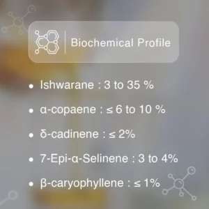 Katafray essential oil is highly concentrated in sesquiterpenes such as ishwarane, alpha-copaene, delta-cadinene, and alpha-selene. These compounds give the oil its main properties, including anti-inflammatory, soothing, and healing effects.