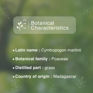 It is possible to export palma rosa essential oil from Madagascar. Aromeya is a palma rosa essential oil wholesaler distributing worldwide. Palma rosa gets its name from its sweet, rose-like fragrance. Known botanically as Cymbopogon, palma rosa is valued for its calming effect on the mind and was even used in some cultures to enhance concentration before magical rituals. In Madagascar, palma rosa grows as a tall herbaceous plant in the Highlands.