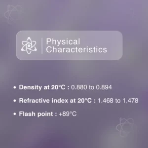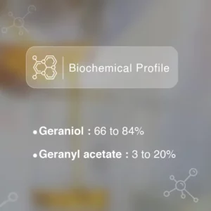 Palma rosa essential oil is highly concentrated in geraniol, a known allergenic biochemical component, with up to 80%. It also contains linalool (≤ 4%), geraniol + nerol (≤ 2%), trans-trans-farnesol (≤ 2%), limonene (≤ 1%), and citronellol (≤ 0.5%). A good palma rosa essential oil should meet specific quality standards. Don’t hesitate to ask your dealer to ensure the authenticity and quality of your oil.