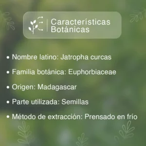 El aceite vegetal de Jatropha puede utilizarse para hidratar la piel y revitalizar el cabello, así como para la fabricación de jabones artesanales y biodiésel. Posee propiedades hidratantes y regeneradoras, lo que lo hace ideal para cuidados cosméticos y terapéuticos.