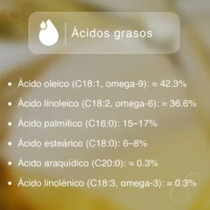 Es hidratante, regenerador, calmante y protector, gracias a su riqueza en ácidos grasos esenciales y compuestos antioxidantes.