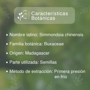 Este pequeño arbusto de 2 metros, con un follaje que recuerda al del olivo y flores amarillas verdosas, crece en la región sureste de Madagascar. Sus semillas se prensan en frío para producir el aceite vegetal de jojoba.