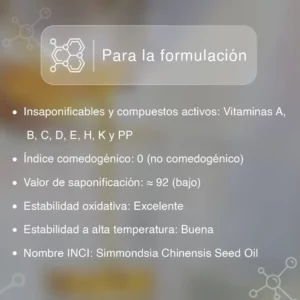 Un buen aceite vegetal de jojoba debe tener las siguientes características. No dude en solicitarlas a su proveedor para asegurarse de la calidad de su aceite.