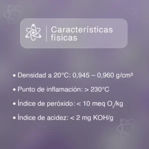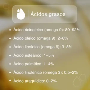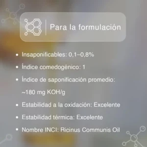 Un buen aceite vegetal de ricino debe tener las siguientes características. No dude en solicitarlas a su proveedor para asegurarse de la calidad de su aceite.