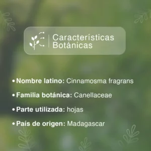 El aceite esencial de Saro, también conocido como mandravasarotra, se distingue por su riqueza en compuestos con múltiples beneficios. Esta diversidad molecular le confiere una amplia gama de propiedades terapéuticas y aromáticas notables. Entre sus características destacadas, se pueden mencionar: