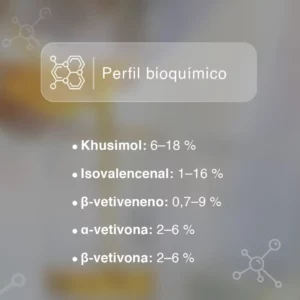 El aceite esencial de vetiver está altamente concentrado en sesquiterpenos y sesquiterpenoles. Estas diferentes moléculas le confieren las siguientes propiedades principales: