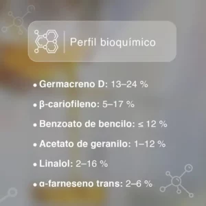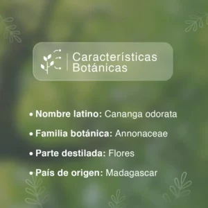 El aceite esencial de ylang-ylang está altamente concentrado en alcoholes y monoterpenos, así como en acetato de geranilo. Estas diferentes moléculas le confieren las siguientes propiedades principales: