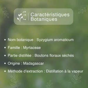 L’huile essentielle de griffe de girofle de Madagascar vendue par Aromeya est efficace dans les cas suivants : • Déficiences immunitaires • Troubles digestifs • Douleurs musculaires • bronchites, rhinopharyngites, sinusites, rhumes • Infection ou douleur dentaire, et migraines liées aux douleurs dentaires