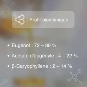 Eugénol, acétate d’eugényle et béta caryophyllène composent principalement l’huile essentielle de griffe de girofle. Ces principaux composants confèrent à l’huile essentielle de griffe de girofle les vertus suivantes :