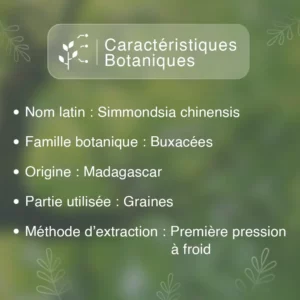 Il est possible d’exporter de l’huile végétale de jojoba de Madagascar. Aromeya est un grossiste d’huile végétale de jojoba à destination du monde entier. Le Simmondsia chinensis, communément appelé jojoba, est originaire des déserts d’Amérique du Sud, d’où provient son nom. Le terme “jojoba” vient du mot mexicain “hojoba,” ensuite prononcé “hohoba” en espagnol. Ayant des propriétés similaires à celles de l’huile de baleine, l’huile végétale de jojoba est largement utilisée depuis les années 1970, période marquée par l’interdiction de la chasse à la baleine, autrefois utilisée dans les cosmétiques. Ce petit arbuste de 2 mètres, au feuillage rappelant celui de l’olivier et aux fleurs jaunes et verdâtres, pousse dans la région sud-est de Madagascar. Ses graines sont pressées à froid pour produire l’huile végétale de jojoba.