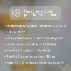 Une bonne huile végétale de jojoba doit avoir les caractéristiques suivantes. N'hésitez pas à les demander à votre marchand pour être sûr de la qualité de votre huile.
