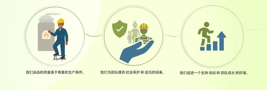 我们油品的质量直接取决于生产条件。我们保证为团队提供社会保护、适当的设备以及一个有利于培训和发展的环境。