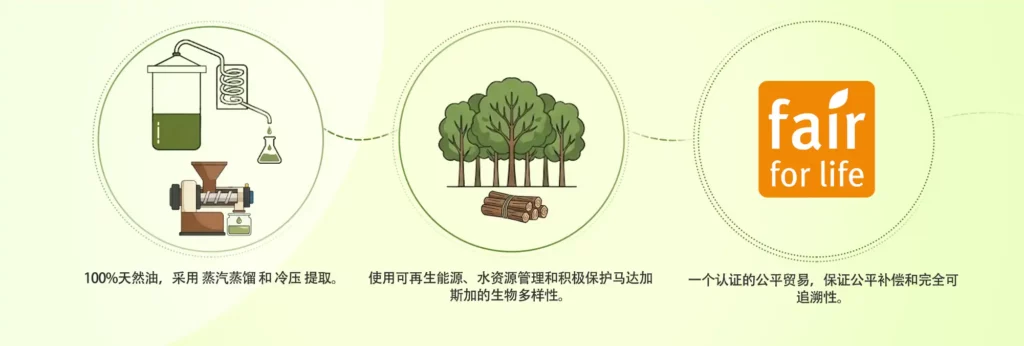 从蒸汽蒸馏到冷压,我们保持天然活性成分的完整性。我们采用负责任的实践:生态系统保护、使用可再生能源如桉树木材,以及优化水资源管理。