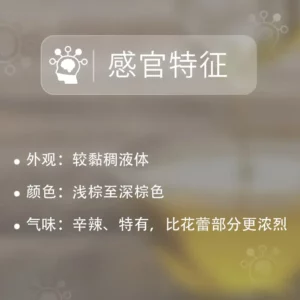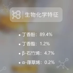 丁香精油含有一种高度浓缩的过敏生化成分:丁香酚(注意!72%–88%)苯甲酸苄酯(≤0.5%)芳樟醇(≤0.2%)异丁香酚(≤0.1%)柠檬烯(≤0.1%)苯甲酸水杨酯(≤0.1%)优质的丁香精油应具备以上特性。请务必向供应商确认,以确保精油的质量。