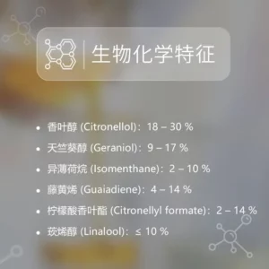 马达加斯加天竺葵精油含有多种可能引起过敏且含量较高的生化成分:,香茅醇(18% 至 30%),香叶醇(9% 至 17%),芳樟醇(3% 至 15%),柠檬醛(香叶醛 + 柠檬醛)(≤2%),柠檬烯(≤0.5%)