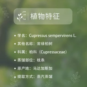 它是通过蒸汽蒸馏常绿丝柏的带叶枝条而获得的。该树原产于地中海地区,也种植于马达加斯加,以其清新、树脂和木质香气而闻名。