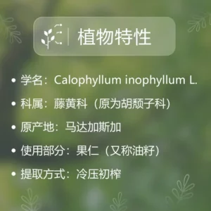 可以从马达加斯加出口椰油树植物油。Aromeya 是一家全球椰油树植物油批发商。Calophyllum inophyllum 是马达加斯加传统医学中非常受欢迎的植物。它生长在大岛的东海岸,马达加斯加当地人称这种植物为foraha,并且使用植物的各个部分来满足日常生活需求。树干用于建造捕鱼的独木舟,叶子通过浸泡或煎煮的方式用于治疗皮肤疾病,而果实则用来提取椰油树植物油。