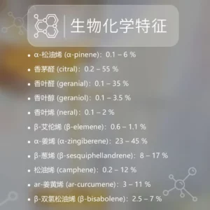 马达加斯加生姜精油含有可能引起过敏的化学成分:柠檬醛和香叶醛(≤3%)、柠檬烯(≤2%)、香叶醇(≤2%)、芳樟醇(≤1%)。
