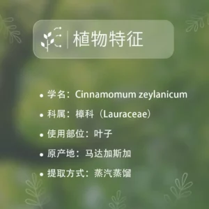 马达加斯加肉桂精油适用于成年人。孕妇、婴儿以及 6 岁以下儿童不得使用肉桂精油。
