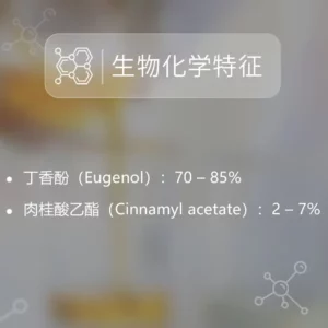 肉桂精油中含有高浓度的过敏成分:丁香酚(70% 至 85%)香豆素(≤ 4%)肉桂醇(≤ 1%)苯甲酸苄酯(≤ 0.1%)苄基醇(≤ 0.3%)法呢醇(≤ 0.01%)芳樟醇(≤ 0.02%)