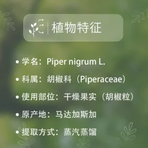 黑胡椒精油的主要成分是β-石竹烯、柠檬烯、蒎烯和δ-3-葵烯。