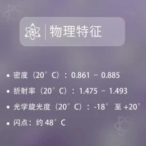 黑胡椒精油含有过敏性生化成分:柠檬烯(14%至23%)和芳樟醇(≤1%)。优质的黑胡椒精油应具备以下特性。如有需要,可向供应商索取相关信息,以确保所购精油的品质。